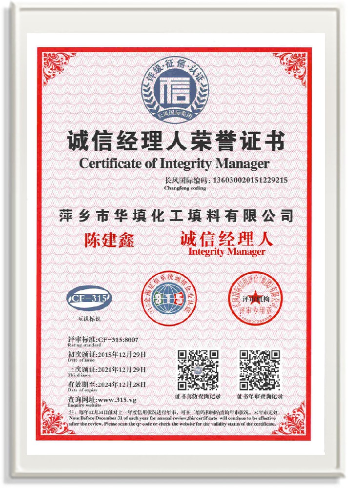 萍鄉市華填化工填料有限公司,位于320國道、109國道、浙贛鐵路、昌金高速公路貫穿其中,交通便利,是江西西部一顆燦爛明珠,創建于20世紀70年代初期,是中國石油天然氣股份有限公司“能源一號網”會員企業、中國石化物資采購電子商務網絡和中國海洋石油總公司采辦業務系統成員單位,是上海大學江西材料基因組工程產業研究院工業陶瓷產業創新聯盟基地,且通過ISO9001:2015質量管理體系、ISO14001:2015環境管理體系、ISO45001:2018職業健康安全管理體系認證的化工填料生產企業。公司擁有陶瓷、塑料、金屬填料、催化劑、活性氧化鋁、分子篩等產品生產線,現有固定資產3616萬元,占地面積3.8萬平方米。公司具有悠久的生產歷史、雄厚的技術力量和先進的生產工藝設備,可生產工業瓷球(支撐劑)、陶瓷、金屬、塑料質的規整、散堆化工填料及分子篩、催化劑、生化濾料、活性氧化鋁、石化助劑、活性炭、環保材料、耐火材料等系列的200多種規格型號產品。
